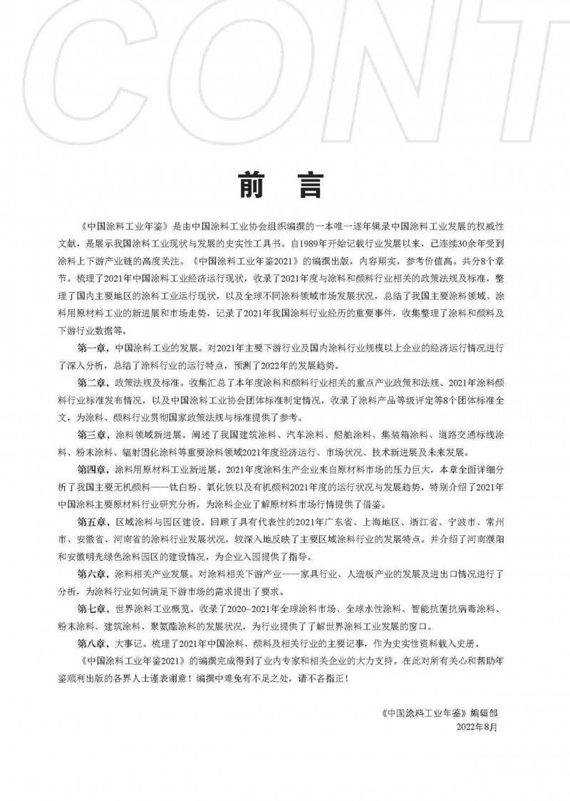《中國(guó)涂料工業(yè)年鑒2021》共分7個(gè)章節(jié),總結(jié)了2021年中國(guó)涂料工業(yè)經(jīng)濟(jì)運(yùn)行現(xiàn)狀,收錄了2021年度與涂料和顏料行業(yè)相關(guān)的政策法規(guī)及標(biāo)準(zhǔn),闡述了我國(guó)涂料細(xì)分領(lǐng)域2021年度經(jīng)濟(jì)運(yùn)行、市場(chǎng)狀況、技術(shù)新進(jìn)展及未來發(fā)展,整理了國(guó)內(nèi)主要地區(qū)的涂料工業(yè)運(yùn)行及園區(qū)建設(shè)現(xiàn)狀,以及全球不同涂料領(lǐng)域市場(chǎng)發(fā)展?fàn)顩r,總結(jié)了我國(guó)主要涂料用原材料工業(yè)的新進(jìn)展和市場(chǎng)走勢(shì),記錄了2021年我國(guó)涂料行業(yè)經(jīng)歷的重要事件等。