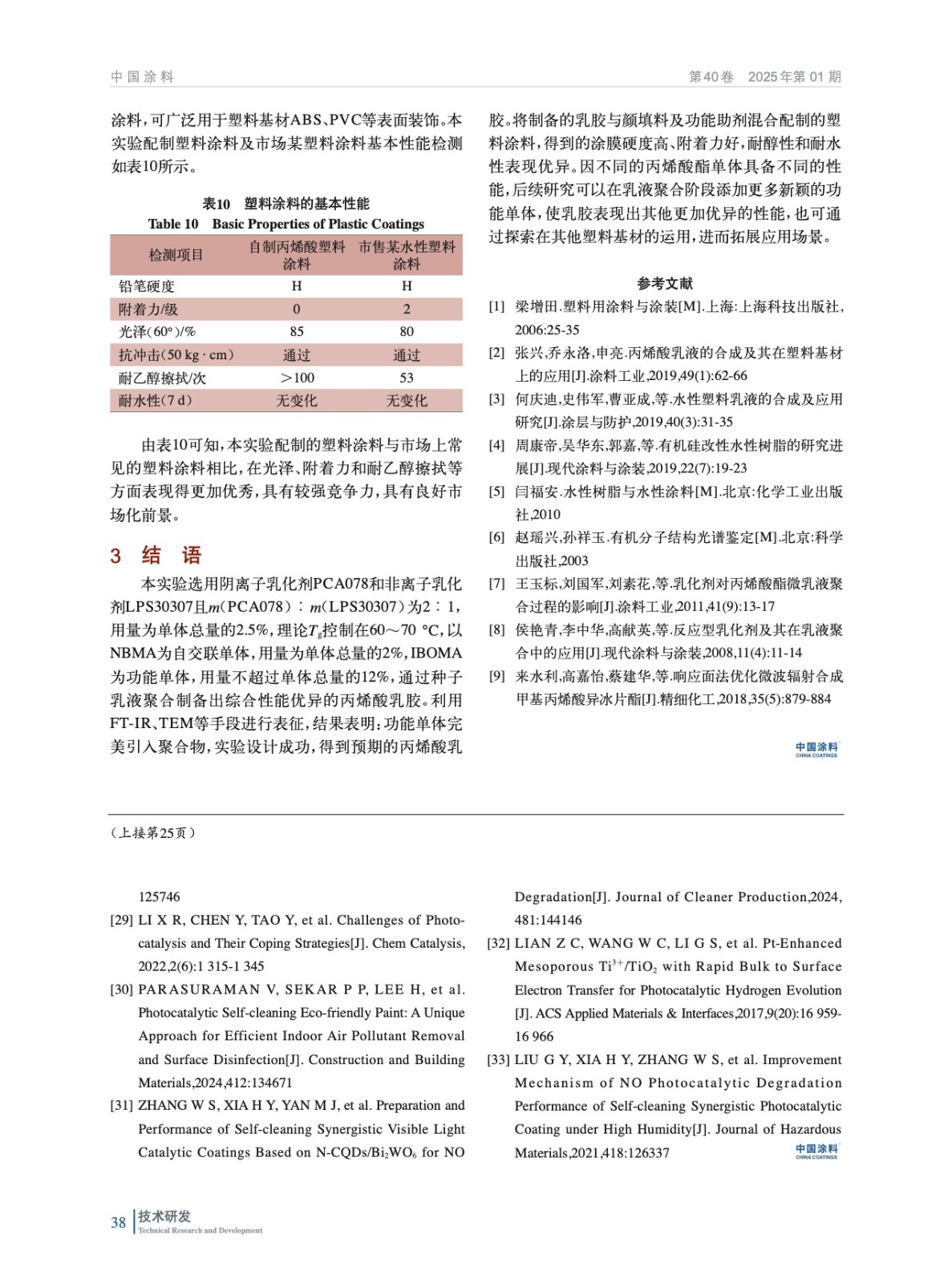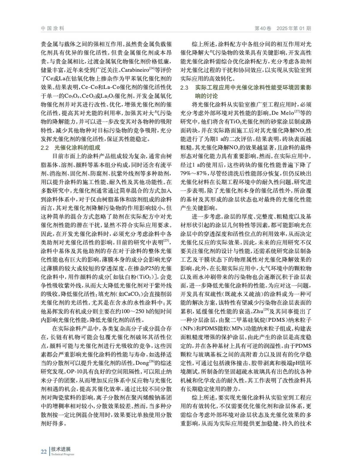 摘要:綜述了光催化涂料的研究進展,探討了涂料的光催化基本原理、關(guān)鍵光催化材料的性能,以及通過元素摻雜和半導(dǎo)體復(fù)合等手段提高光催化效率的策略。探討了光催化涂料中的非本征和本征因素影響光催化涂料的性能,包括涂料配方、測試環(huán)境、涂層物理狀態(tài)和外部環(huán)境因素等。研究表明,盡管光催化涂料在控制條件下顯示出較高的污染物降解效率,但在實際環(huán)境中應(yīng)用時,其性能受到多種因素的影響,包括復(fù)雜的環(huán)境條件和長期穩(wěn)定性的挑戰(zhàn)。未來的研究應(yīng)專注于解決光催化涂料在實際應(yīng)用中遇到的挑戰(zhàn),包括提高材料對可見光的響應(yīng)能力,優(yōu)化涂料配方以減少助劑的負面影響,以及增強涂料的環(huán)境適應(yīng)性和耐用性。此外,更深入地研究光催化涂料在實際環(huán)境中的性能,特別是在多污染物共存和不同氣候條件下的表現(xiàn),將對其商業(yè)化應(yīng)用至關(guān)重要。