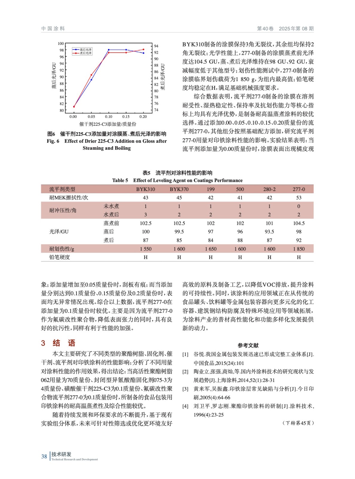 摘要:研究了不同型號的聚酯樹脂、固化劑、催干劑及流平劑對食品包裝用耐高溫蒸煮聚酯印鐵涂料性能的影響,并分析了各組分用量對其性能的作用效果。研究發現:高活性聚酯樹脂062型在70質量份時制備的涂膜耐高溫蒸煮性、耐化學溶劑性、抗沖壓開裂性及光澤穩定性較優;4質量份封閉型異氰酸酯固化劑075-3與0.1質量份磺酸催干劑225-C3協同增強涂膜交聯密度,提升機械強度與固化效率;氟碳改性聚合物流平劑277-0在0.1質量份時有效消除涂膜橘皮現象與刮板痕跡,達到高平整度。