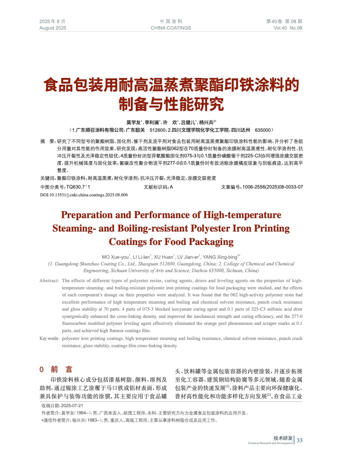 食品包裝用耐高溫蒸煮聚酯印鐵涂料的制備與性能研究