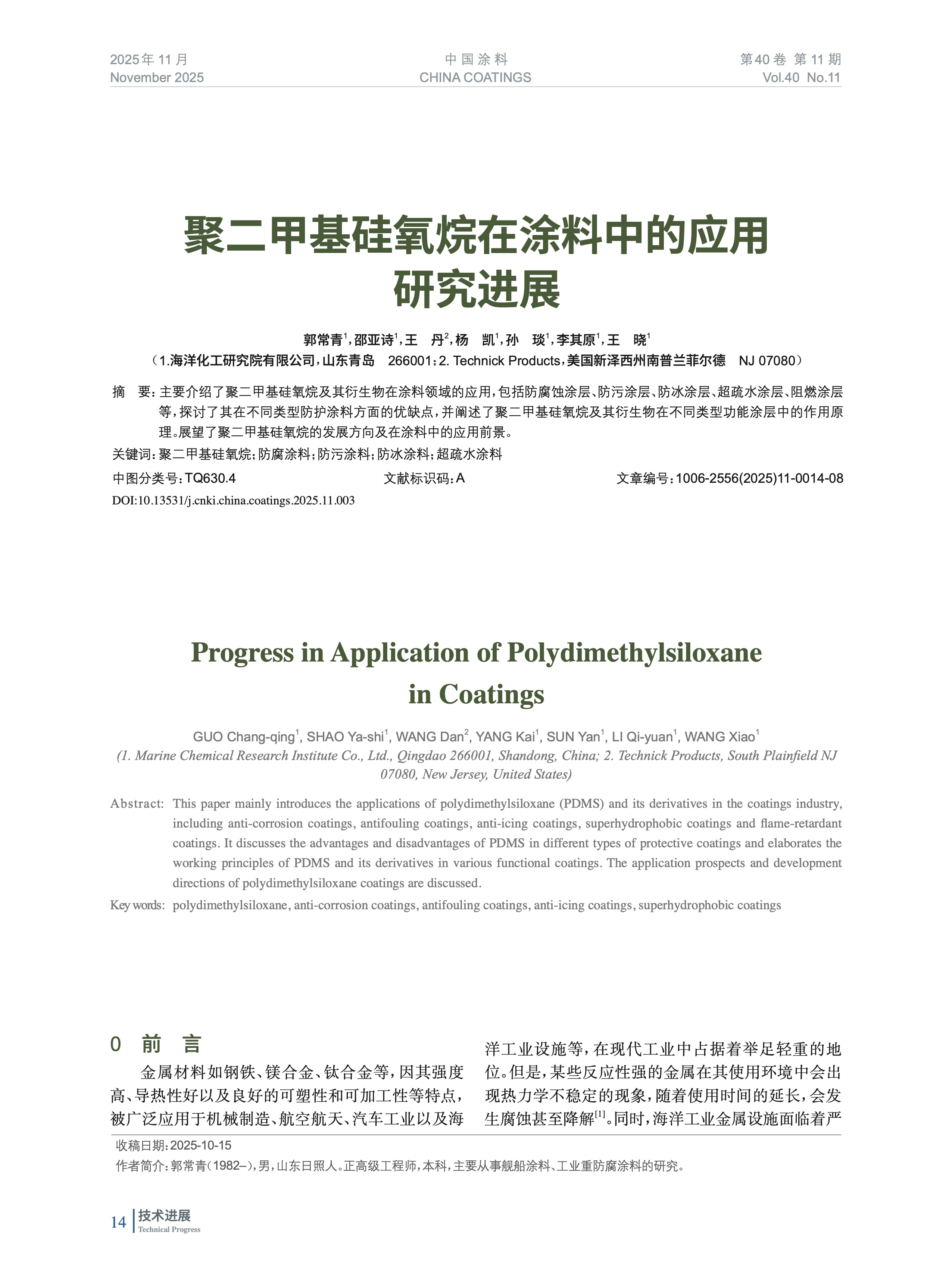 引用格式:郭常青,邵亞詩,王丹,等.聚二甲基硅氧烷在涂料中的應用研究進展[J].中國涂料,2025,40(11):14-21