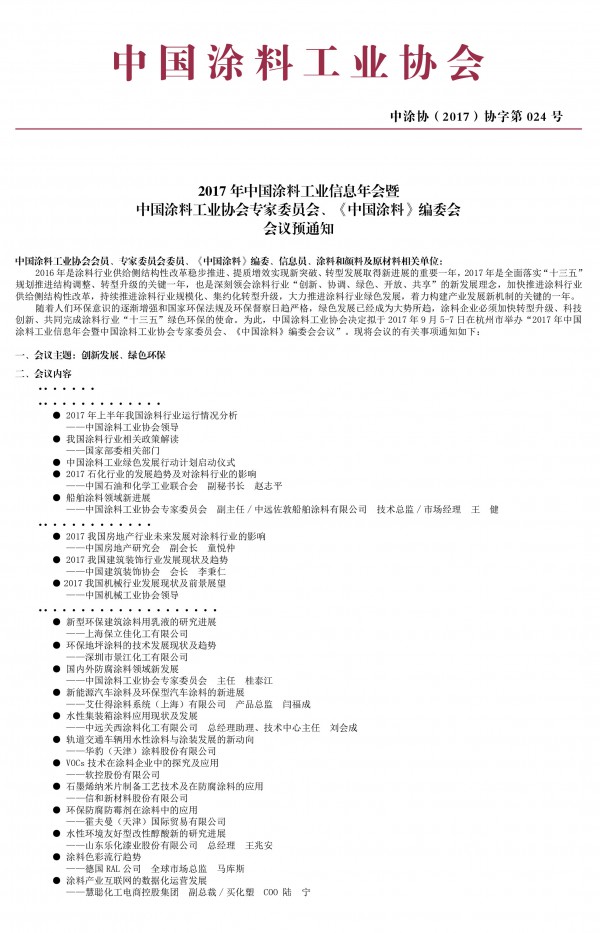 隨著人們環(huán)保意識(shí)的逐漸增強(qiáng)和國(guó)家環(huán)保法規(guī)及環(huán)保督察日趨嚴(yán)格,綠色發(fā)展已經(jīng)成為大勢(shì)所趨,涂料企業(yè)必須加快轉(zhuǎn)型升級(jí)、科技創(chuàng)新、共同完成涂料行業(yè)“十三五”綠色環(huán)保的使命。為此,中國(guó)涂料工業(yè)協(xié)會(huì)決定擬于2017年9月5-7日在杭州市舉辦“2017年中國(guó)涂料工業(yè)信息年會(huì)暨中國(guó)涂料工業(yè)協(xié)會(huì)專(zhuān)家委員會(huì)、《中國(guó)涂料》編委會(huì)會(huì)議”,屆時(shí)召開(kāi)中國(guó)涂料工業(yè)協(xié)會(huì)水性工業(yè)涂料涂裝分會(huì)籌備會(huì)。現(xiàn)將會(huì)議的有關(guān)事項(xiàng)通知如下: