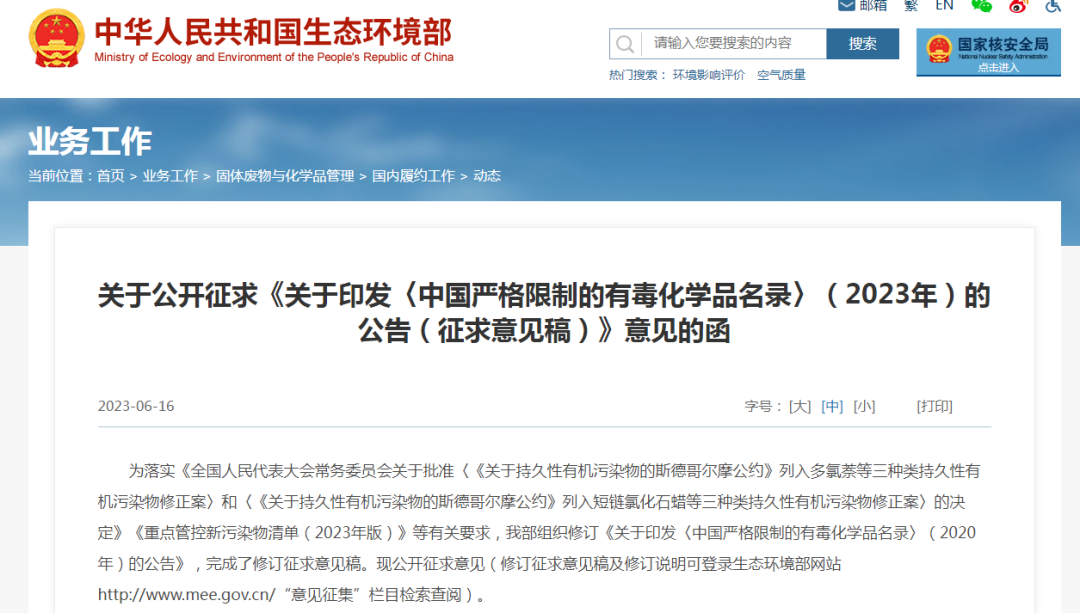 日前,中華人民共和國生態環境部發布公告,公開征求《中國嚴格限制的有毒化學品名錄》(2023年)(征求意見稿)。意見指出: